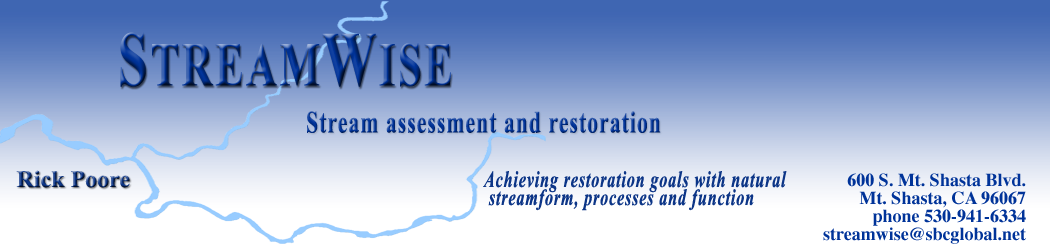 Mission Statement StreamWise is committed to science-based restoration that mimics the natural processes, form, and function of stream ecosystems. We base our work on understanding the historic, self-maintaining conditions and native vegetation that lend stability, biologic diversity, and aesthetic quality to the channel form. To insure continuing long-term success, StreamWise works with the private sector and public agencies to establish adaptive management guidelines for the ongoing assessment and management of restored stream systems. Our philosophy is to use the natural form and function of stream systems to the greatest extent possible as the basis for restoration design or management solutions. We believe that nature's engineering has proven superior to the use of structural components to achieve dynamic channel stability. StreamWise is a broad-based, experienced group of resource professionals working together to produce state-of-the-art assessments of stream condition and function. We have formed working associations with native plant specialists, equipment operators, engineers, and resource agency staff to provide a full range of project services. © 2011 Stream Wise . All rights reserved |